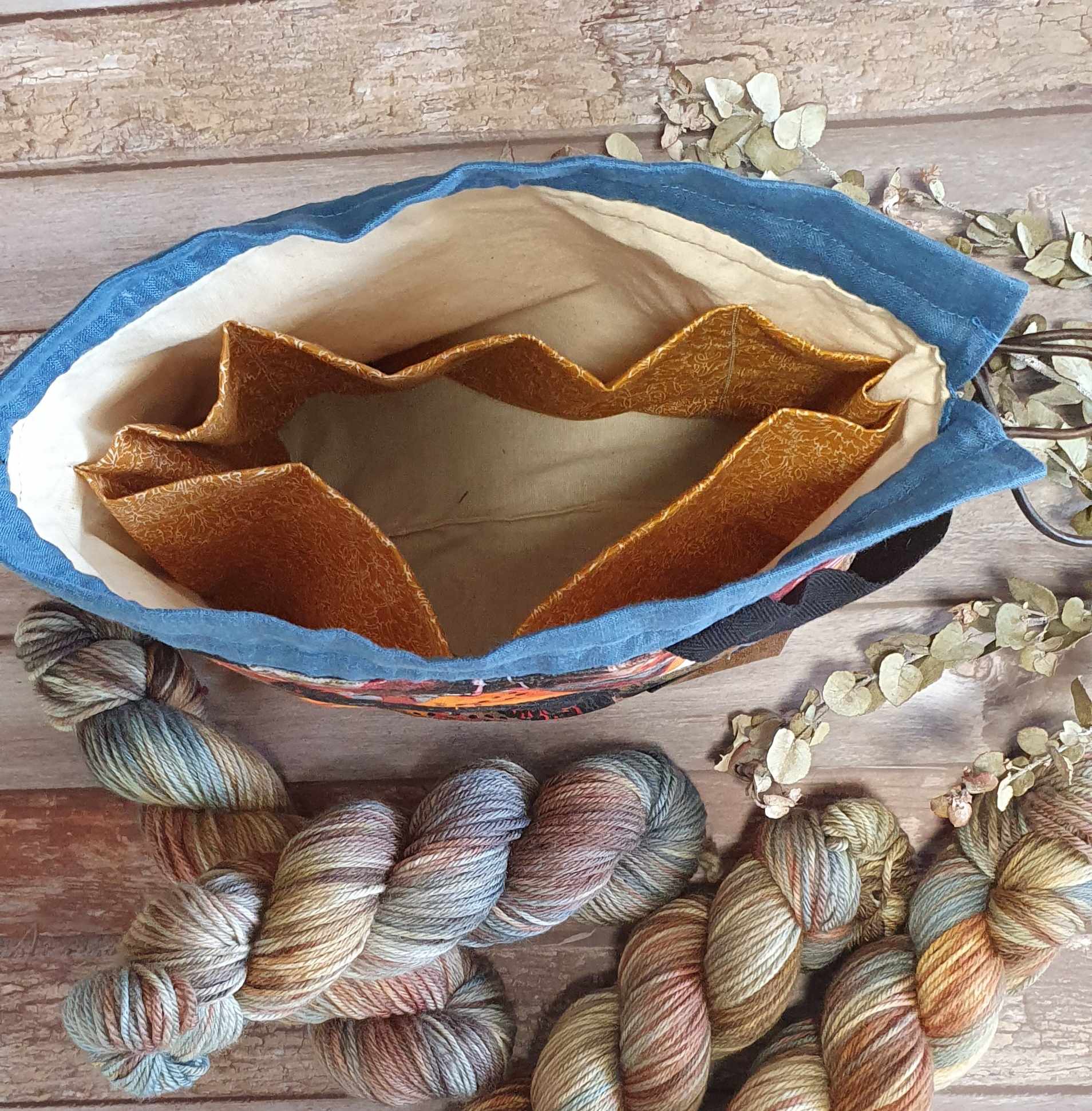 Our Outback Project bag is a 3 Skein size bag. It is fully lined with unbleached calico and has generous internal pockets made from Liberty of London Quilters cotton fabric. The external fabric is 100% Australian cotton canvas designed by Australian artist Ally Bryan of Coloured Space Design who lives locally on the Northern Beaches of Sydney and printed for us by Next State Textile printers in Melbourne. The base is a sturdy vegan suede and the ties are leather cord threaded through re-enforced linen. The bag design is by Kandou Crafts and was my favourite design when I went hunting for the perfect project bag.