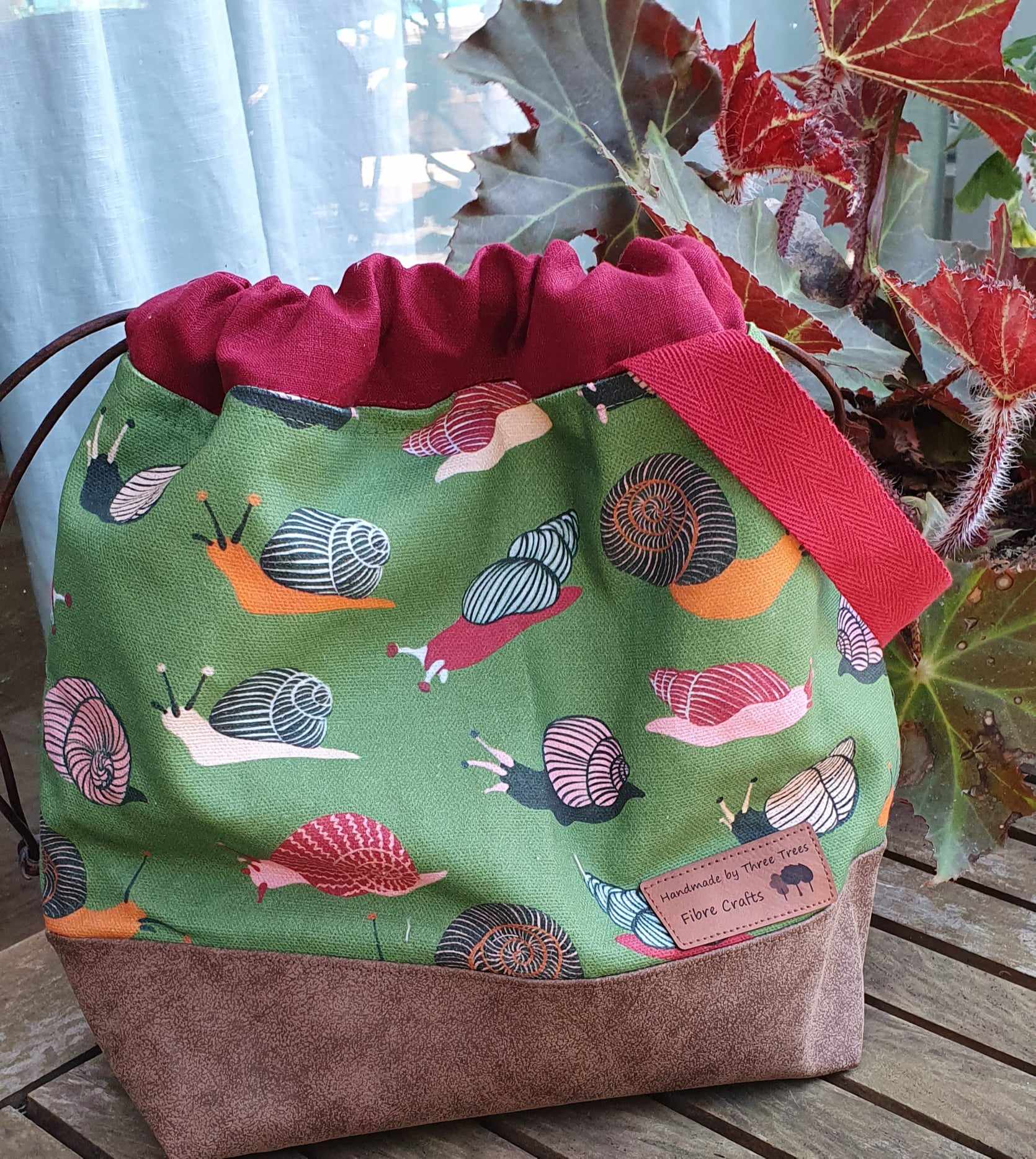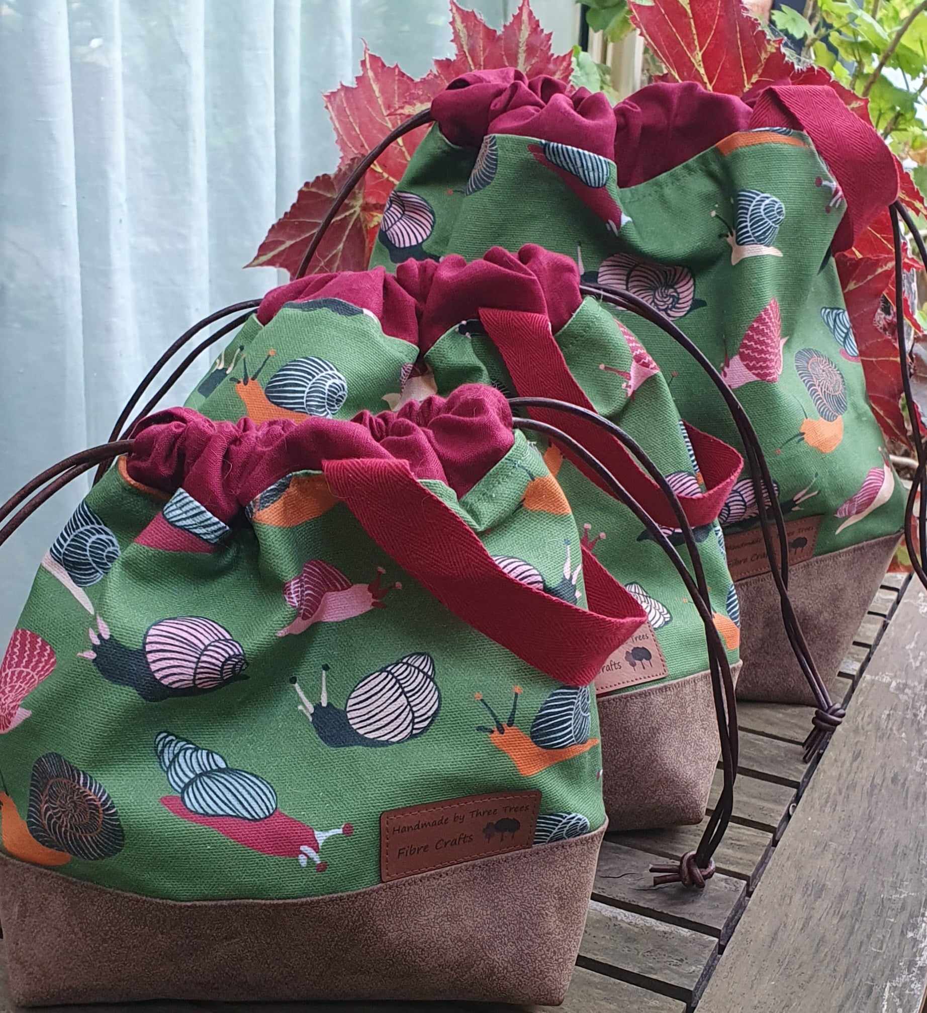 They are fully lined with unbleached calico, has generous internal pockets made from re-enforced liberty cotton and the external fabric is 100% Australian cotton canvas designed by West Australian designer Megan Isabella and printed for us in Melbourne. The base is a sturdy vegan suede and the ties are leather cord threaded through re-enforced linen. The bag design is by Kandou Crafts and was my favourite design when I went hunting for the perfect large size project bag.